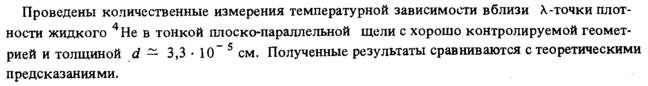 Проведены количественные измерения температурной зависимости вблизи λ-точки плотности жидкого 4 Не в тонкой плоско-параллельной щели с хорошо контролируемой геометрией и толщиной d — 3,3 · Ю~ 5 см. Полученные результаты сравниваются с теоретическими предсказаниями.