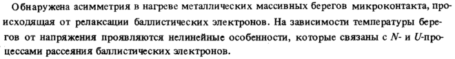 Обнаружена асимметрия в нагреве металлических массивных берегов микроконтакта, происходящая от релаксации баллистических электронов. На зависимости температуры берегов от напряжения проявляются нелинейные особенности, которые связаны с Nи {/-процессами рассеяния баллистических электронов.