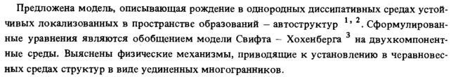Предложена модель, описывающая рождение в однородных диссипативных средах устойчивых локализованных в пространстве образований автоструктур 1,2. Сформулированные уравнения являются обобщением модели Свифта Хохенберга 3 на двухкомпонент-ные среды. Выяснены физические механизмы, приводящие к установлению в неравновесных средах структур в виде уединенных многогранников.