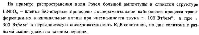 На примере распространения волн Рэлея большой амплитуды в слоистой структуре LiNb03 пленка SiO впервые проведено экспериментальное наблюдение процесса трансформации их в кноидальные волны при интенсивности звука ~ 100 Вт/мм2, а при ;· 300 Вт/мм2 в периодическую последовательность КдВ-солитонов, по два солитона с разными амплитудами на каждом периоде.