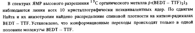 В спектрах ЯМР высокого разрешения 1 3С органического металла β-KBEDTTTF)2I3 наблюдаются линии всех 10 кристаллографически неэквивалентных ядер. По сдвигам Найта и их анизотропии найдено распределение спиновой плотности на катион-радикалах BEDT TTF. Установлено, что конформационные переходы происходят только в одной половине молекулы BEDT TTF,