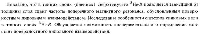Показано, что в тонких слоях (пленках) сверхтекучего *Не-В появляется зависящий от толщины слоя сдвиг частоты поперечного магнитного резонанса, обусловленный поверхностным дипольным взаимодействием. Исследованы особенности спектров спиновых волн в тонких слоях 3Не~£. Обсуждается возможность экспериментального определения констант поверхностного дипольного взаимодействия.