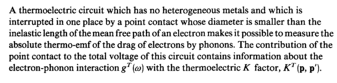 A thermoelectric circuit which has no heterogeneous metals and which is interrupted in one place by a point contact whose diameter is smaller than the inelastic length of the mean free path of an electron makes it possible to measure the absolute thermo-emf of the drag of electrons by phonons. The contribution of the point contact to the total voltage of this circuit contains information about the electron-phonon interaction gT(co) with the thermoelectric К factor, Κτ(ρ, p').