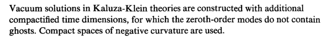 Vacuum solutions in Kaluza-Klein theories are constructed with additional compactified time dimensions, for which the zeroth-order modes do not contain ghosts. Compact spaces of negative curvature are used.