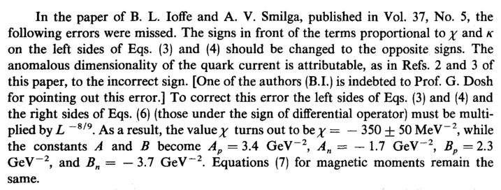 In the paper of B. L. IofFe and Α. V. Smilga, published in Vol. 37, No. 5, the following errors were missed. The signs in front of the terms proportional to χ and к on the left sides of Eqs. (3) and (4) should be changed to the opposite signs. The anomalous dimensionality of the quark current is attributable, as in Refs. 2 and 3 of this paper, to the incorrect sign. [One of the authors (B.I.) is indebted to Prof. G. Dosh for pointing out this error.] To correct this error the left sides of Eqs. (3) and (4) and the right sides of Eqs. (6) (those under the sign of differential operator) must be multiplied by L ~8/9. As a result, the value χ turns out to be χ = — 350 + 50 MeV-2, while the constants A and В become Ap = 3.4 GeV"2, An = 1.7 GeV~2, Bp =2.3 GeV-2, and Bn = — 3.7 GeV-2. Equations (7) for magnetic moments remain the same.