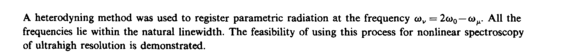 A heterodyning method was used to register parametric radiation at the frequency ων = 2ω0 — ωμ. All the frequencies lie within the natural linewidth. The feasibility of using this process for nonlinear spectroscopy of ultrahigh resolution is demonstrated.
