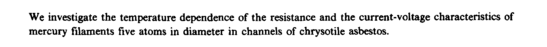 We investigate the temperature dependence of the resistance and the current-voltage characteristics of mercury filaments five atoms in diameter in channels of chrysotile asbestos.