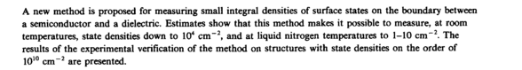 A new method is proposed for measuring small integral densities of surface states on the boundary between a semiconductor and a dielectric. Estimates show that this method makes it possible to measure, at room temperatures, state densities down to 104 cm-2, and at liquid nitrogen temperatures to 1-10 cm"2. The results of the experimental verification of the method on structures with state densities on the order of 1010 cm-2 are presented.