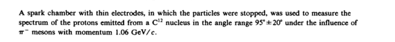 A spark chamber with thin electrodes, in which the particles were stopped, was used to measure the spectrum of the protons emitted from aC12 nucleus in the angle range 95° ±20° under the influence of 7г~ mesons with momentum 1.06 GeV/c.