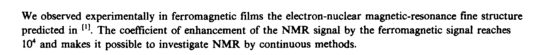 We observed experimentally in ferromagnetic films the electron-nuclear magnetic-resonance fine structure predicted in il\ The coefficient of enhancement of the NMR signal by the ferromagnetic signal reaches 104 and makes it possible to investigate NMR by continuous methods.