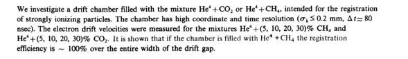 We investigate a drift chamber filled with the mixture He4 + C02 or He4 + CH4, intended for the registration of strongly ionizing particles. The chamber has high coordinate and time resolution (o~k S0.2 mm, Δ tz* 80 nsec). The electron drift velocities were measured for the mixtures He4+ (5, 10, 20, 30)% CH4 and He4+ (5, 10, 20, 30)% C02. It is shown that if the chamber is filled with He4 +CH4 the registration efficiency is — 100% over the entire width of the drift gap.