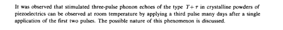 It was observed that stimulated three-pulse phonon echoes of the type Γ+ τ in crystalline powders of piezoelectrics can be observed at room temperature by applying a third pulse many days after a single application of the first two pulses. The possible nature of this phenomenon is discussed.