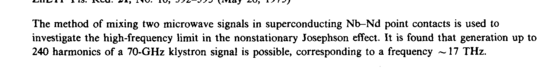 The method of mixing two microwave signals in superconducting Nb-Nd point contacts is used to investigate the high-frequency limit in the nonstationary Josephson effect. It is found that generation up to 240 harmonics of a 70-GHz klystron signal is possible, corresponding to a frequency —17 THz.