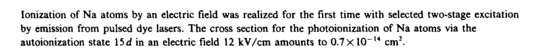 Ionization of Na atoms by an electric field was realized for the first time with selected two-stage excitation by emission from pulsed dye lasers. The cross section for the photoionization of Na atoms via the autoionization state \bd in an electric field 12 kV/cm amounts to 0.7X 10"14 cm2.