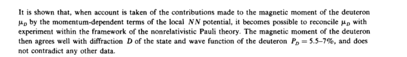 It is shown that, when account is taken of the contributions made to the magnetic moment of the deuteron μΩ by the momentum-dependent terms of the local NN potential, it becomes possible to reconcile μΒ with experiment within the framework of the nonrelativistic Pauli theory. The magnetic moment of the deuteron then agrees well with diffraction D of the state and wave function of the deuteron PD = 5.5-7%, and does not contradict any other data.