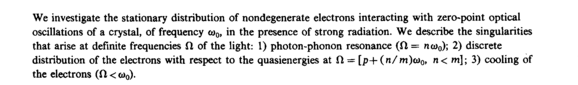 We investigate the stationary distribution of nondegenerate electrons interacting with zero-point optical oscillations of a crystal, of frequency ω0, in the presence of strong radiation. We describe the singularities that arise at definite frequencies Ω of the light: 1) photon-phonon resonance (Ω = ηω0); 2) discrete distribution of the electrons with respect to the quasienergies at Ω = [p+ (η/τη)ω0, n< m]; 3) cooling of the electrons (Ω < ω0).