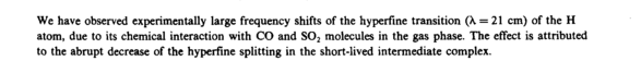 We have observed experimentally large frequency shifts of the hyperfine transition (λ = 21 cm) of the Η atom, due to its chemical interaction with CO and S02 molecules in the gas phase. The effect is attributed to the abrupt decrease of the hyperfine splitting in the short-lived intermediate complex.