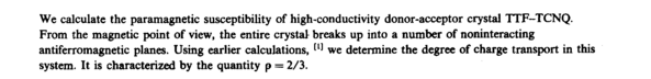 We calculate the paramagnetic susceptibility of high-conductivity donor-acceptor crystal TTF-TCNQ. From the magnetic point of view, the entire crystal breaks up into a number of noninteracting antiferromagnetic planes. Using earlier calculations, [1] we determine the degree of charge transport in this system. It is characterized by the quantity ρ — 2/3.