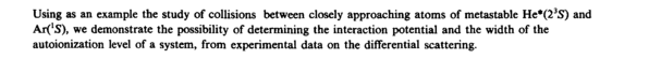 Using as an example the study of collisions between closely approaching atoms of metastable He*(23S) and Ar^S), we demonstrate the possibility of determining the interaction potential and the width of the autoionization level of a system, from experimental data on the differential scattering.