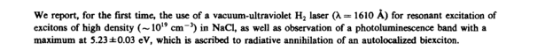 We report, for the first time, the use of a vacuum-ultraviolet H2 laser (λ = 1610 A) for resonant excitation of excitons of high density (~ 1019 cm-3) in NaCl, as well as observation of a photoluminescence band with a maximum at 5.23 ±0.03 eV, which is ascribed to radiative annihilation of an autolocalized biexciton.