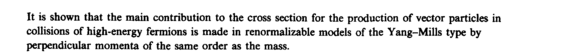 It is shown that the main contribution to the cross section for the production of vector particles in collisions of high-energy fermions is made in renormalizable models of the Yang-Mills type by perpendicular momenta of the same order as the mass.