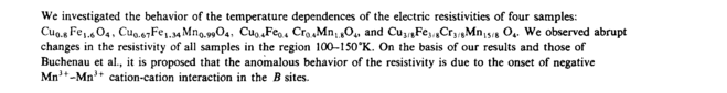 We investigated the behavior of the temperature dependences of the electric resistivities of four samples: Cu0.8Fei.6O4, Cuo.67FeL34Mno.99O4, CuQ4FeQ4 óÇ04íÐ!8ï4( and Cu3/gFe3i8Cr3/8Mn15i& 04. We observed abrupt changes in the resistivity of all samples in the region 100-150°K. On the basis of our results and those of Buchenau et al, it is proposed that the anomalous behavior of the resistivity is due to the onset of negative Mn3+-Mn3+ cation-cation interaction in the ÷ sites.