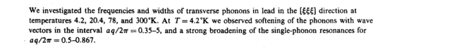 We investigated the frequencies and widths of transverse phonons in lead in the [ξξξ] direction at temperatures 4.2, 20.4, 78, and 300°K. At T = 4.2°K we observed softening of the phonons with wave vectors in the interval aq/ΐπ = 0.35-5, and a strong broadening of the single-phonon resonances for ας/2π = 0.5-0.867.