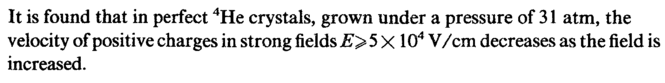 It is found that in perfect 4He crystals, grown under a pressure of 31 atm, the velocity of positive charges in strong fields E> 5 X 104 V/cm decreases as the field is increased.