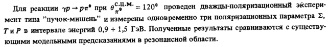 Для реакции ур^рп* при 0^Ц'М'=12О° проведен дважды-поляризационный эксперимент типа "пучок-мишень" и измерены одновременно три поляризационных параметра Σ, ТнР в интервале энергий 0,9 + 1,5 ГэВ. Полученные результаты сравниваются с существующими модельными предсказаниями в резонансной области.