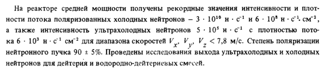 На реакторе средней мощности получены рекордные значения интенсивности и плотности потока поляризованных холодных нейтронов — 3 · 1010 н · с-1 и 6 · 10е н ■ с"1* см"2, а также интенсивность ультрахолодных нейтронов 5 · 105 н * с-1 с плотностью потока 6 · 103 н · с"1 см"2 для диапазона скоростей V , V ,, V ύ < 7,8 м/с. Степень поляризации χ у ζ нейтронного пучка 90 ± 5%. Проведены исследования выхода ультрахолодных и холодных нейтронов для дейтерия и водородно-дейтериевых смесей.