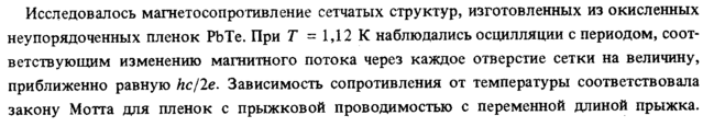 Исследовалось магнетосопротивление сетчатых структур, изготовленных из окисленных неупорядоченных пленок РЬТе. При Τ = 1,12 К наблюдались осцилляции с периодом, соответствующим изменению магнитного потока через каждое отверстие сетки на величину, приближенно равную hc/2e. Зависимость сопротивления от температуры соответствовала закону Мотта для пленок с прыжковой проводимостью с переменной длиной прыжка.