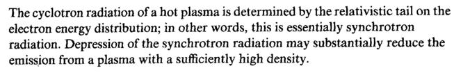The cyclotron radiation of a hot plasma is determined by the relativistic tail on the electron energy distribution; in other words, this is essentially synchrotron radiation. Depression of the synchrotron radiation may substantially reduce the emission from a plasma with a sufficiently high density.