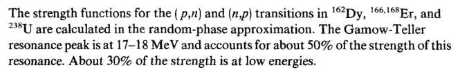 The strength functions for the {p,n) and (n,p) transitions in 162Dy, 166,168Er, and 238U are calculated in the random-phase approximation. The Gamow-Teller resonance peak is at 17-18 MeV and accounts for about 50% of the strength of this resonance. About 30% of the strength is at low energies.