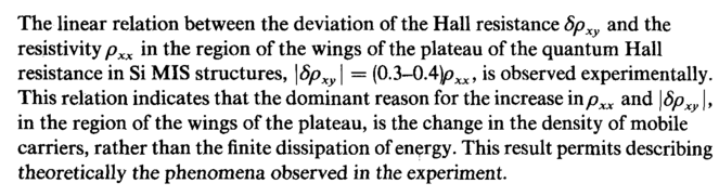 The linear relation between the deviation of the Hall resistance 8pxy and the resistivity pxx in the region of the wings of the plateau of the quantum Hall resistance in Si MIS structures, \Spxy \ = (0.3-0.4^?^, is observed experimentally. This relation indicates that the dominant reason for the increase inpxx and \Spxy |, in the region of the wings of the plateau, is the change in the density of mobile carriers, rather than the finite dissipation of energy. This result permits describing theoretically the phenomena observed in the experiment.