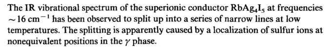 The IR vibrational spectrum of the superionic conductor RbAg4l5 at frequencies ~16 cm -1 has been observed to split up into a series of narrow lines at low temperatures. The splitting is apparently caused by a localization of sulfur ions at nonequivalent positions in the γ phase.