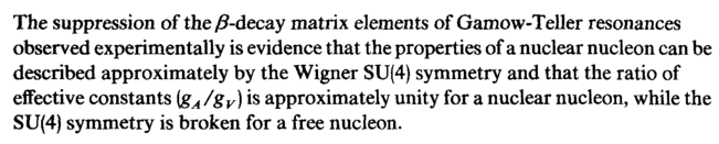 The suppression of the β-decay matrix elements of Gamow-Telier resonances observed experimentally is evidence that the properties of a nuclear nucleon can be described approximately by the Wigner SU(4) symmetry and that the ratio of effective constants (gA/gv) is approximately unity for a nuclear nucleon, while the SU(4) symmetry is broken for a free nucleon.