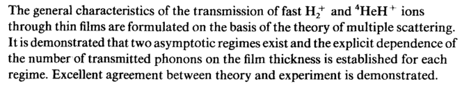 The general characteristics of the transmission of fast H2+ and 4HeH+ ions through thin films are formulated on the basis of the theory of multiple scattering. It is demonstrated that two asymptotic regimes exist and the explicit dependence of the number of transmitted phonons on the film thickness is established for each regime. Excellent agreement between theory and experiment is demonstrated.
