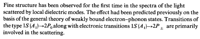 Fine structure has been observed for the first time in the spectra of the light scattered by local dielectric modes. The effect had been predicted previously on the basis of the general theory of weakly bound electron-phonon states. Transitions of the type IS [Al)-+2P0 along with electronic transitions \S{A1)—*2P± are primarily involved in the scattering.