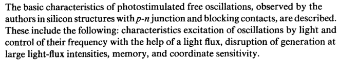 The basic characteristics of photostimulated free oscillations, observed by the authors in silicon structures withp-n junction and blocking contacts, are described. These include the following: characteristics excitation of oscillations by light and control of their frequency with the help of a light flux, disruption of generation at large light-flux intensities, memory, and coordinate sensitivity.