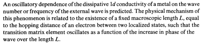 An oscillatory dependence of the dissipative \d conductivity of a metal on the wave number or frequency of the external wave is predicted. The physical mechanism of this phenomenon is related to the existence of a fixed macroscopic length L, equal to the hopping distance of an electron between two localized states, such that the transition matrix element oscillates as a function of the increase in phase of the wave over the length L.