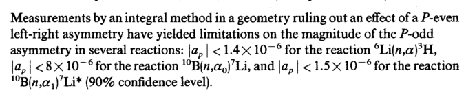 Measurements by an integral method in a geometry ruling out an effect of a P-even left-right asymmetry have yielded limitations on the magnitude of the P~odd asymmetry in several reactions: \ap \ < 1.4 Χ 10-6 for the reaction 6Li(rt,<z)3H, \dp I <8X 10~6 for the reaction 10В(л,а0)71Л, and \ap | < 1.5 Χ10-6 for the reaction 10B(/i,a!)7Li* (90% confidence level).