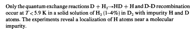 Only the quantum exchange reactions D + H2—>HD 4Η and D-D recombination occur at T< 5.9 К in a solid solution of H2 (1-4%) in D2 with impurity Η and D atoms. The experiments reveal a localization of Η atoms near a molecular impurity.