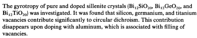 The gyrotropy of pure and doped sillenite crystals (Bi12SiO20, Bi12GeO20, and Bi12TiO20) was investigated. It was found that silicon, germanium, and titanium vacancies contribute significantly to circular dichroism. This contribution disappears upon doping with aluminum, which is associated with filling of vacancies.