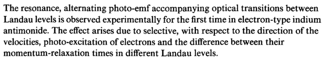 The resonance, alternating photo-emf accompanying optical transitions between Landau levels is observed experimentally for the first time in electron-type indium antimonide. The effect arises due to selective, with respect to the direction of the velocities, photo-excitation of electrons and the difference between their momentum-relaxation times in different Landau levels.