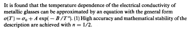 It is found that the temperature dependence of the electrical conductivity of metallic glasses can be approximated by an equation with the general form o\ Τ) = σ0 ΗA exp( — В /Тп). (1) High accuracy and mathematical stability of the description are achieved with η = 1/2.