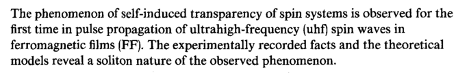 The phenomenon of self-induced transparency of spin systems is observed for the first time in pulse propagation of ultrahigh-frequency (uhf) spin waves in ferromagnetic films (FF). The experimentally recorded facts and the theoretical models reveal a soliton nature of the observed phenomenon.