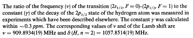 The ratio of the frequency (v) of the transition (2sl/2, F= ^h{^Pm*F= 1) to the constant (γ) of the decay of the 2pl/2 state of the hydrogen atom was measured in experiments which have been described elsewhere. The constant γ was calculated within —0.3 ppm. The corresponding values of ν and of the Lamb shift are ν = 909.8934(19) MHz and δ(Η,η = 2) = 1057.8514(19) MHz.