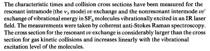 The characteristic times and collision cross sections have been measured for the resonant intramode (the v3 mode) vv exchange and the nonresonant intermode vv' exchange of vibrational energy in SF6 molecules vibrationally excited in an IR laser field. The measurements were taken by coherent anti-Stokes Raman spectroscopy. The cross section for the resonant vv exchange is considerably larger than the cross section for gas kinetic collisions and increases linearly with the vibrational excitation level of the molecules.