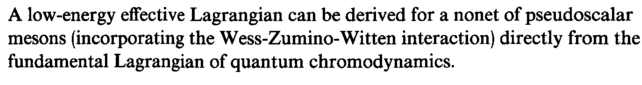 A low-energy effective Lagrangian can be derived for a nonet of pseudoscalar mesons (incorporating the Wess-Zumino-Witten interaction) directly from the fundamental Lagrangian of quantum chromodynamics.