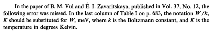 In the paper of В. M. Vul and Ε. I. Zavaritskaya, published in Vol. 37, No. 12, the following error was missed. In the last column of Table I on p. 683, the notation W/k, К should be substituted for W, meV, where к is the Boltzmann constant, and К is the temperature in degrees Kelvin.